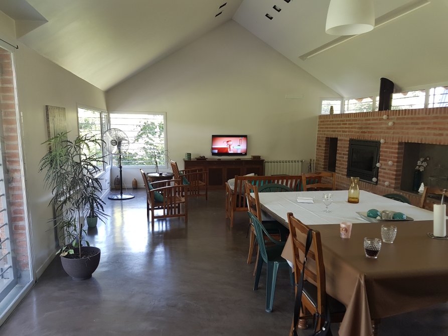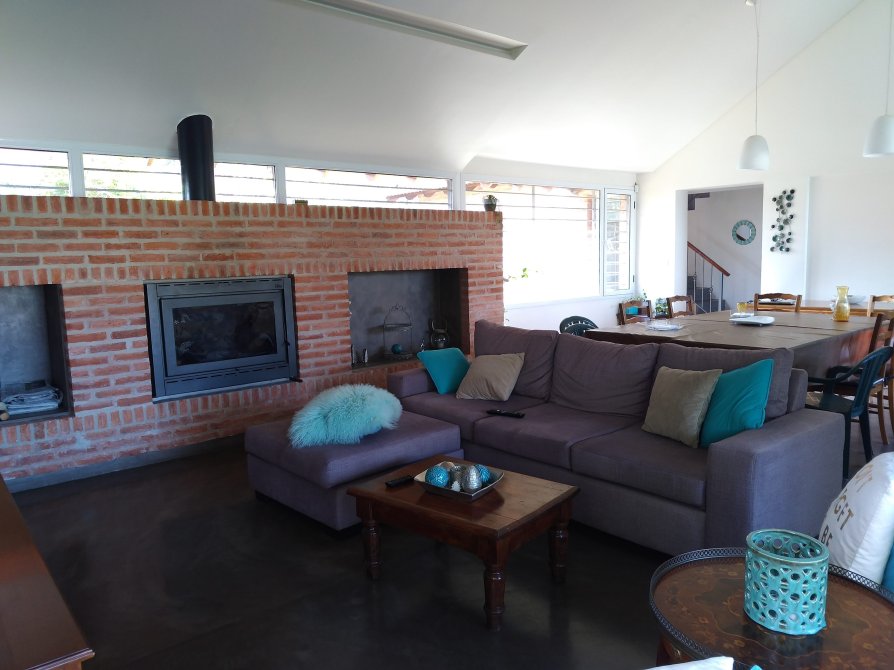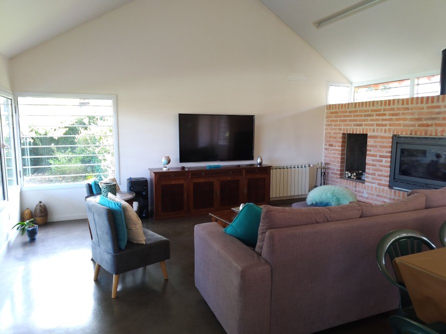 un espacio versátil y acogedor, equipado con una moderna salamandra empotrada marca